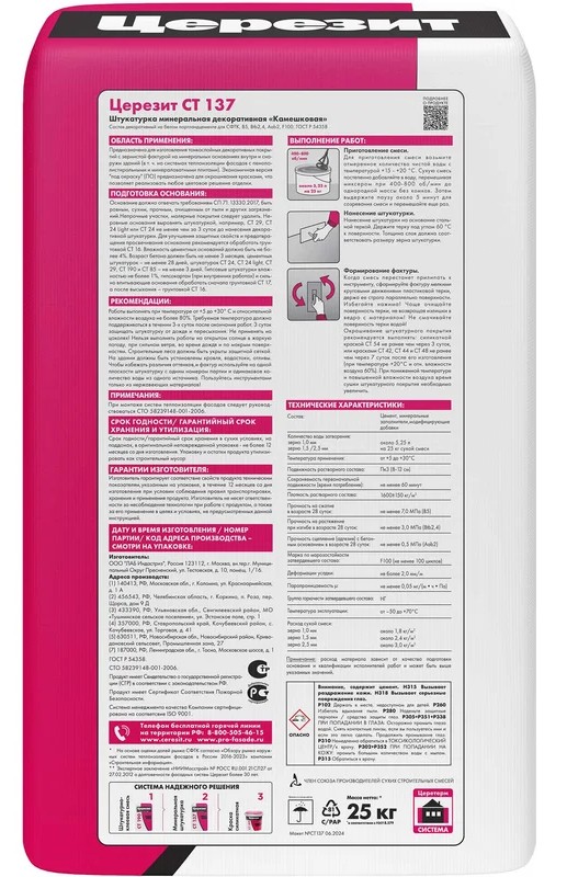 Технические характеристики «Штукатурка декоративная Церезит CT 137 «камешковая» под окраску 2,5 мм 25 кг»