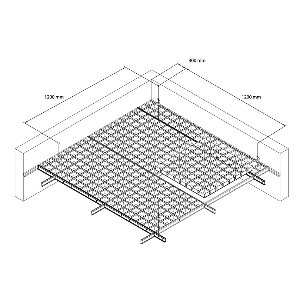 Предназначен для устройства подвесного растрового потолка в помещениях общего назначения: интерьеры общественных, производственных и вспомогательных зданий и сооружений, лечебно-профилактические учреждения, предприятия общественного питания, офисы, концертные залы, театры, вокзалы и др. Потолок представляет собой трехмерную подвесную конструкцию , состоящую из алюминиевых U-образных профилей («мама» и «папа»), которая в собранном виде представляет собой решетку.
