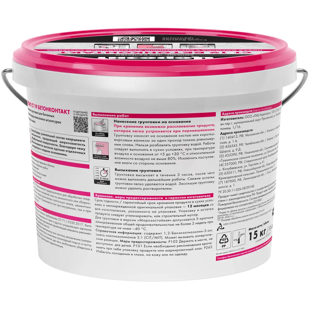 Грунт Бетонконтакт Ceresit CT19 поставляется в пластиковых ведрах по 15 кг и 5 кг. Хранить лучше всего в сухих условиях, в оригинальной и герметичной упаковке, при температуре от +5 до +35°С — не более 12 месяцев со дня изготовления. Для грунтовки в версии «Зима» допускается до 5 циклов замораживания при температуре не ниже –40°C общей продолжительностью не более 2 недель. В случае замораживания выдержать грунтовку в теплом помещении до полного оттаивания и перемешать.