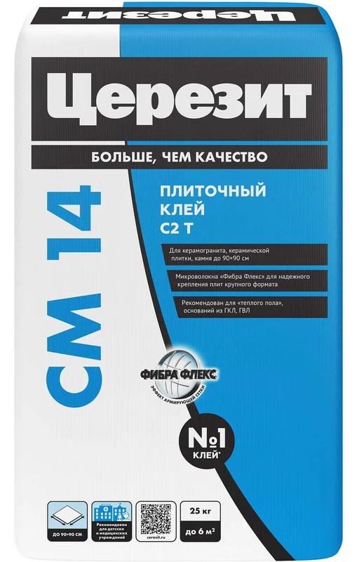 Церезит CM 14 – высококачественный цементный клей с полимерными добавками для приклеивания плитки и керамогранита внутри и снаружи помещений. Идеально подходит для укладки плит любого формата, включая крупноформатную керамику и керамогранит, на бетонные, цементно-песчаные и гипсовые основания.