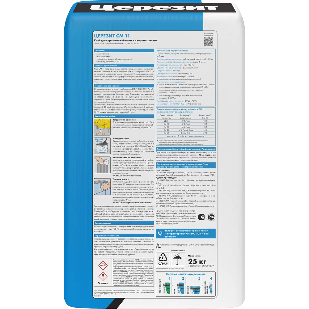 Технические характеристики «Клей для плитки Церезит CM 11 PRO серый (класс С1Т) 25 кг»