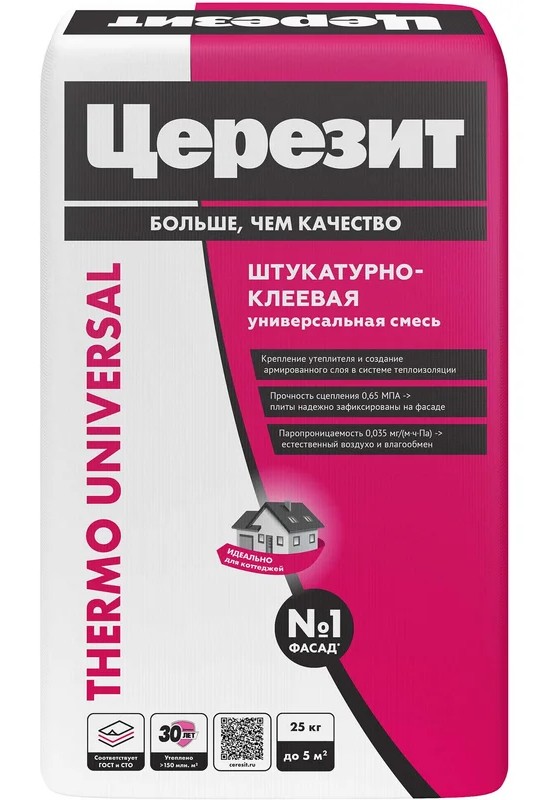 Церезит Thermo Universal – универсальная сухая смесь на цементной основе, предназначенная для приклеивания плит утеплителя (пенополистирол, минеральная вата) и устройства армирующего слоя в системах утепления фасадов. Отличается высокой прочностью, долговечностью и удобством нанесения.