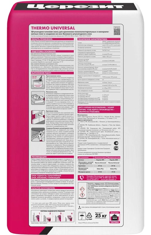Церезит Thermo Universal зима - предназначена для крепления на минеральных основаниях пенополистирольных и минераловатных теплоизоляционных плит и создания на них базового штукатурного слоя. Используется по следующим основаниям: бетон, кирпич, газо – и пенобетонные блоки, поверхности цементных, цементно-известковых, гипсовых штукатурок, пенополистирольные и минераловатные теплоизоляционные плиты. Экструзионный пенополистирол требует предварительного ошкуривания. Наносится вручную и машинным способом.