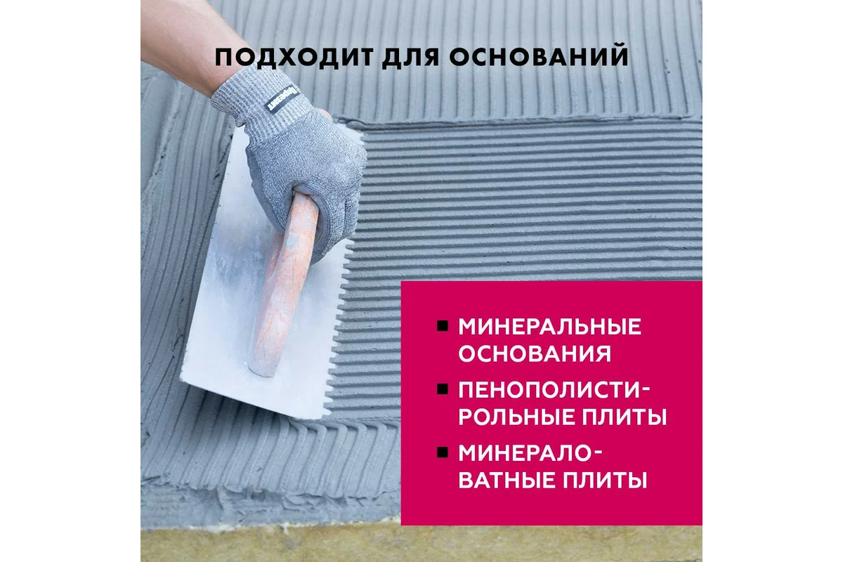 - обладает высокой адгезией к минеральным основаниям и плитам утеплителя;