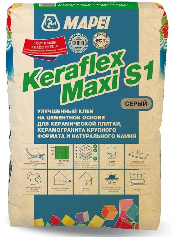 KERAFLEX MAXI S1 этот улучшенный клей на цементной основе предназначен для укладки керамической плитки и натурального камня с толщиной нанесения от 3 до 15 мм. Он обладает полным отсутствием оползания на вертикальных поверхностях и увеличенным открытым временем благодаря беспыльной технологии Dust Free.
