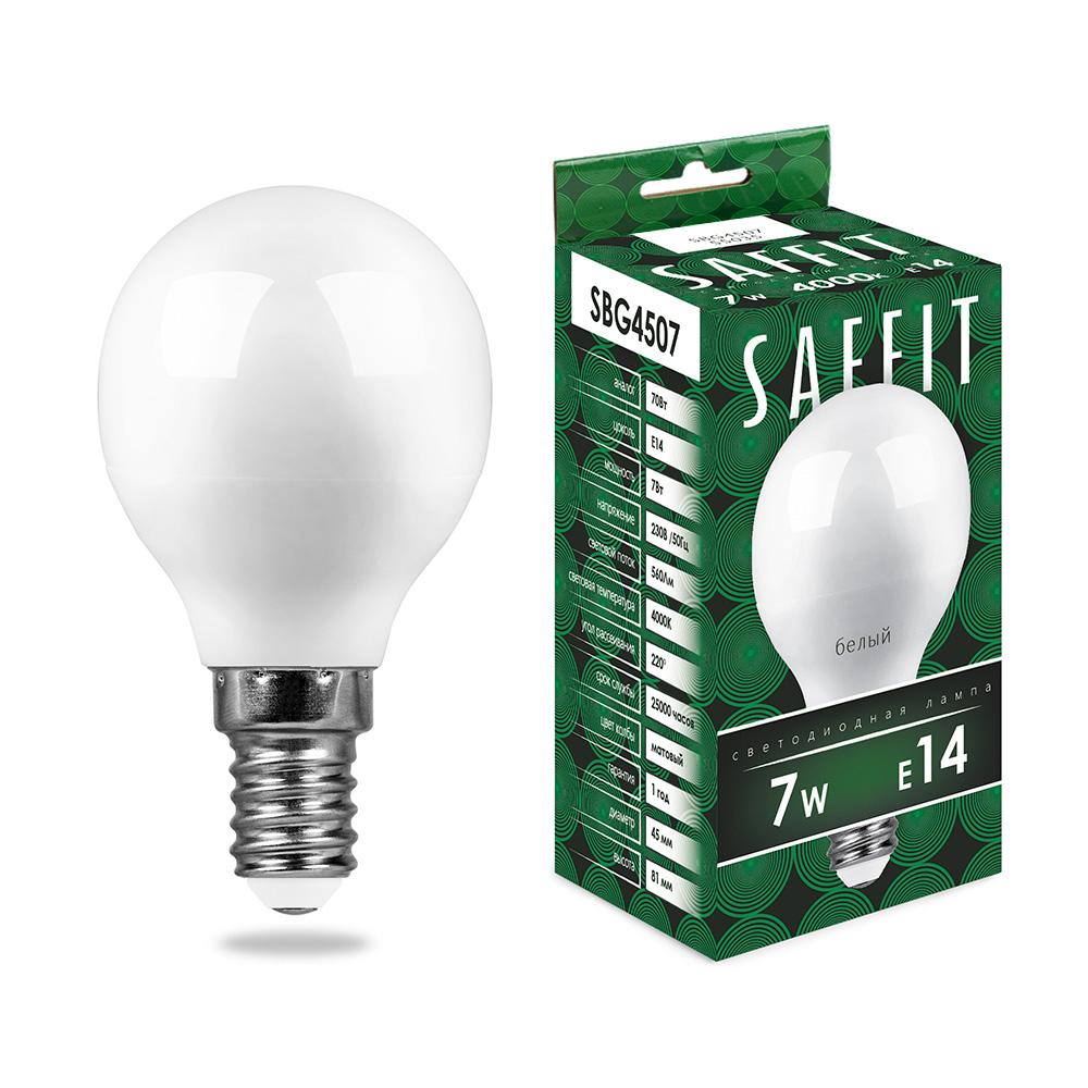 Технические характеристики «Лампа светодиодная SAFFIT SBG4507 Шарик E14 7W 230V 4000K»