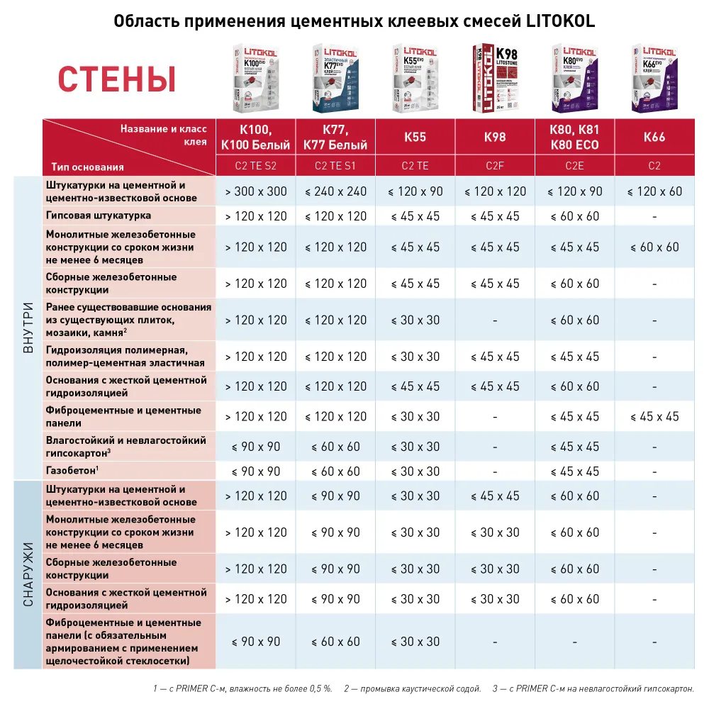 Материалы оснований – керамика, бетон, цемент, керамогранит, гипсокартон и др.