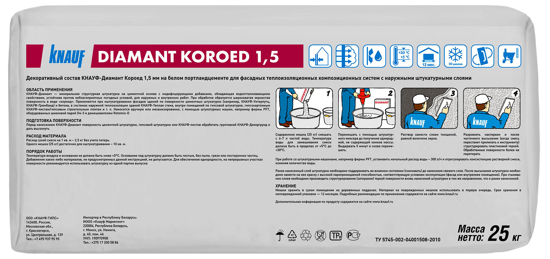 Технические характеристики «Штукатурка декоративная Knauf Диамант Короед 1,5 мм, 25 кг»