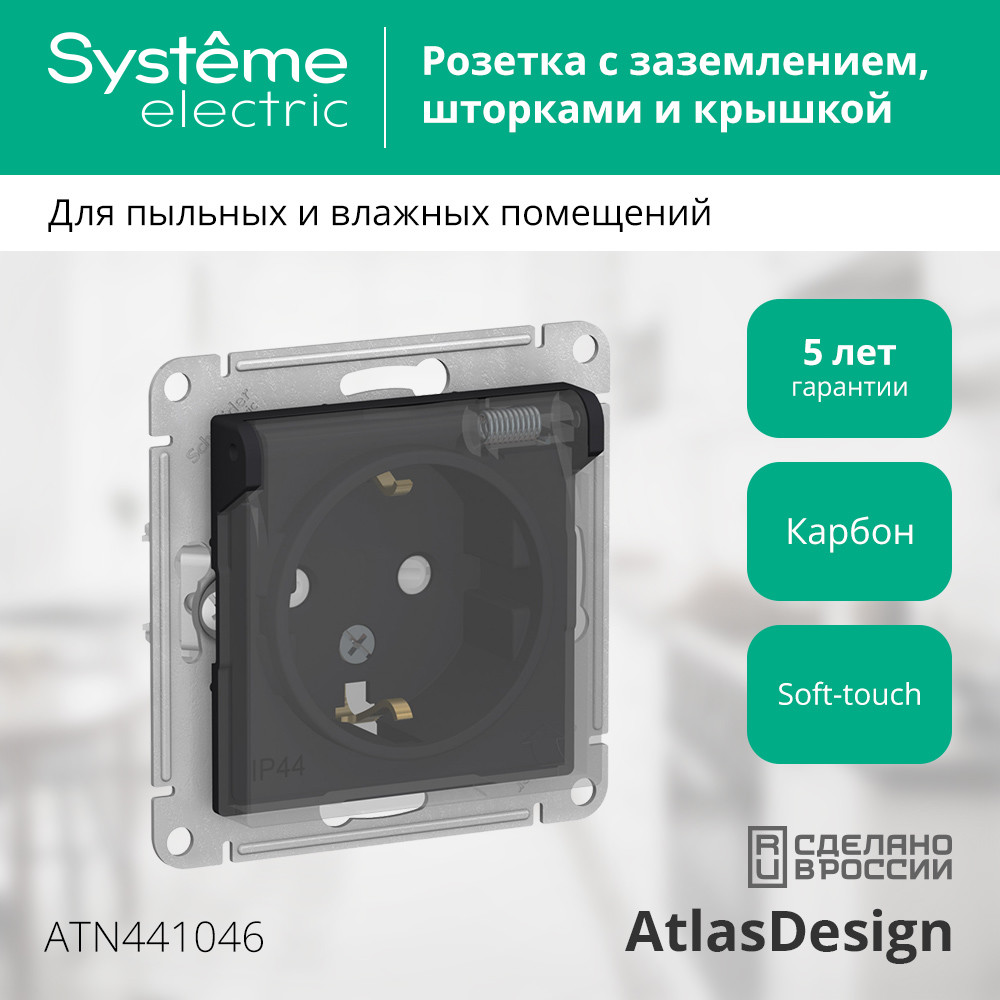 Технические характеристики «ATLASDESIGN AQUA РОЗЕТКА с заземлением со шторкамис прозрачной крышкой, 16А, IP44, механизм, КАРБОН»