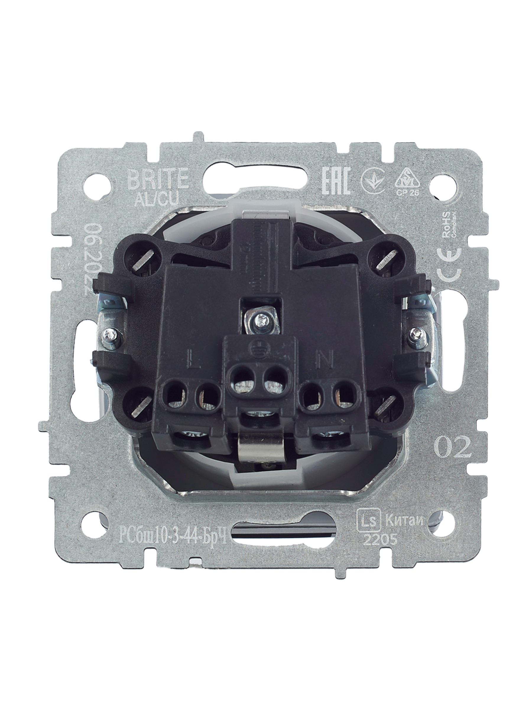 Технические характеристики «BRITE Розетка с заземлением с защитными шторками и крышкой 16А IP44 РСбш10-3-44-БрЧ черный»