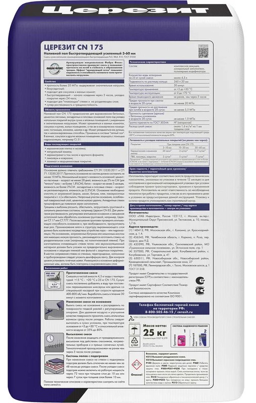 Технические характеристики «Наливной пол Церезит CN 175 SUPER самовыравнивающийся 25 кг»