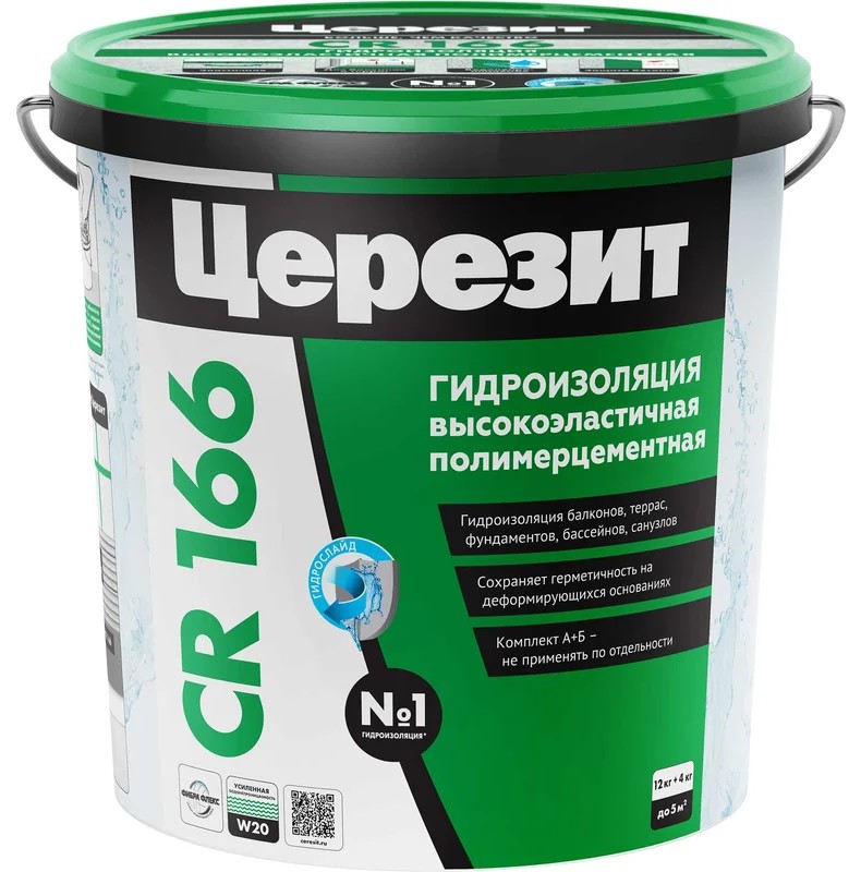 Церезит CR 166/16 – это двухкомпонентная эластичная цементно-полимерная гидроизоляция, состоящая из сухой смеси (компонент A) и полимерной дисперсии (компонент B). После смешивания образует эластичный, водонепроницаемый и трещиностойкий слой, надежно защищающий конструкции от влаги и давления воды. Подходит для внутренних и наружных работ, включая сложные основания, подверженные деформациям.