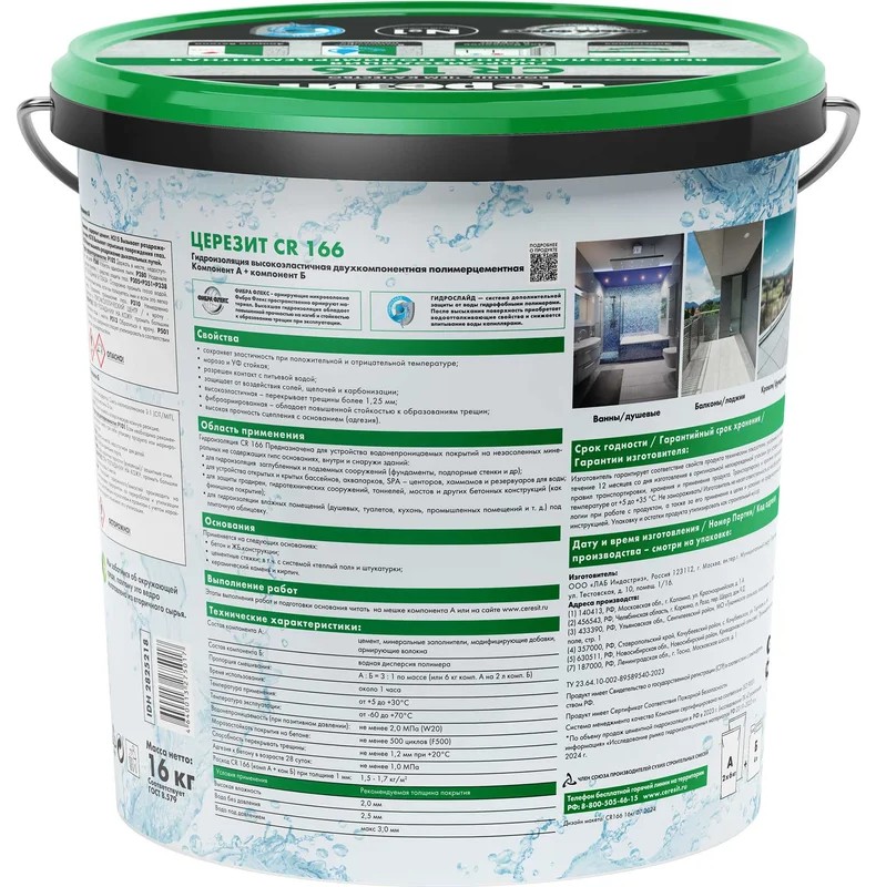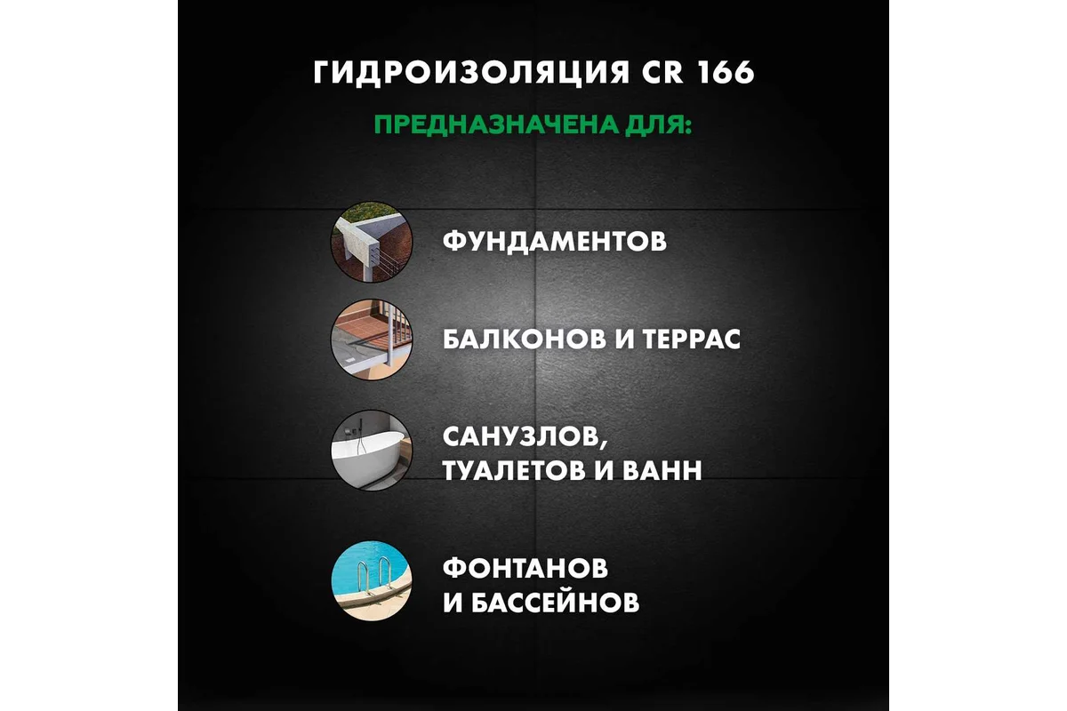 Церезит CR 166/16 используется для гидроизоляции фундаментов, цоколей, подвалов, бассейнов, резервуаров, балконов, террас, санузлов и душевых. Подходит для бетонных, кирпичных и цементно-песчаных оснований, в том числе подверженных деформациям.