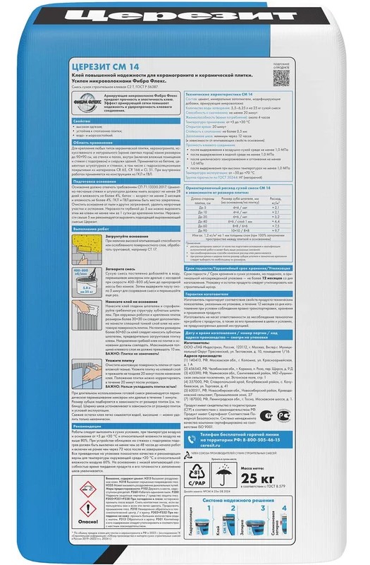Технические характеристики «Клей для плитки и керамогранита Церезит CM 14 (класс C2T) 25 кг»