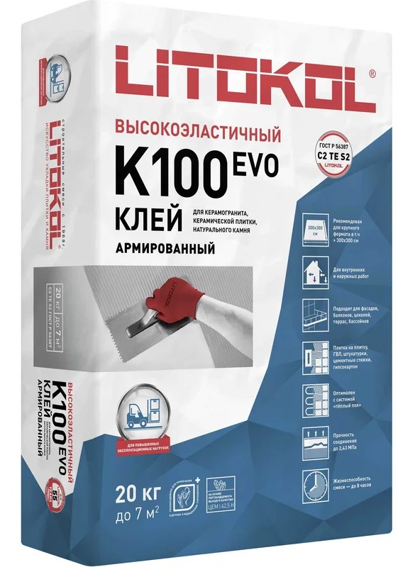 Технические характеристики «Клей высокоэластичный для укладки крупноформатных плит Litokol Hyperflex K100 (класс С2 TЕ S2) 20 кг»