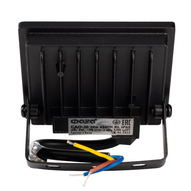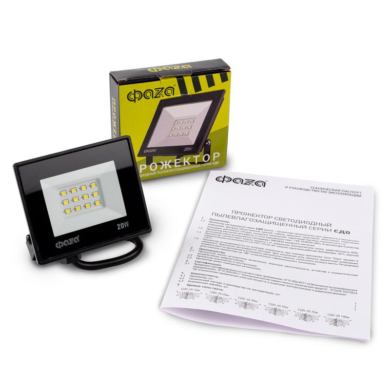 Технические характеристики «Прожектор светодиодный СДО-20 20Вт 6500К IP65 230В BL ДО прозр. закален. стекло ФАZА 5047266»