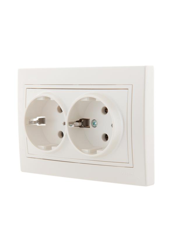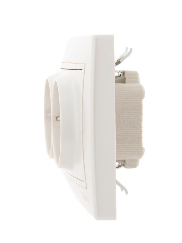 Корпус представляет собой форму из негорючего пластика, белого цвета, с защитными шторками, автоматически закрывающими гнезда розетки при вынутой вилке. Основание керамическое. Подпружиненные лапки крепления обеспечивают комфортный и легкий монтаж изделия. Предусмотрена возможность установки без применения монтажной коробки.