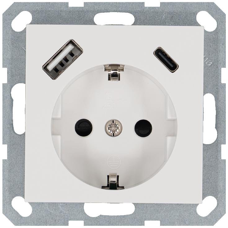 Отгружаем «Розетка Shuko 16А с заземл. защ. шторки с 2-мя заряд. устройствами USB тип A+C 25Вт механизм бел. глянцевый Jasmart G5501USB-25W» с оптовых складов, рынков и напрямую с заводов.