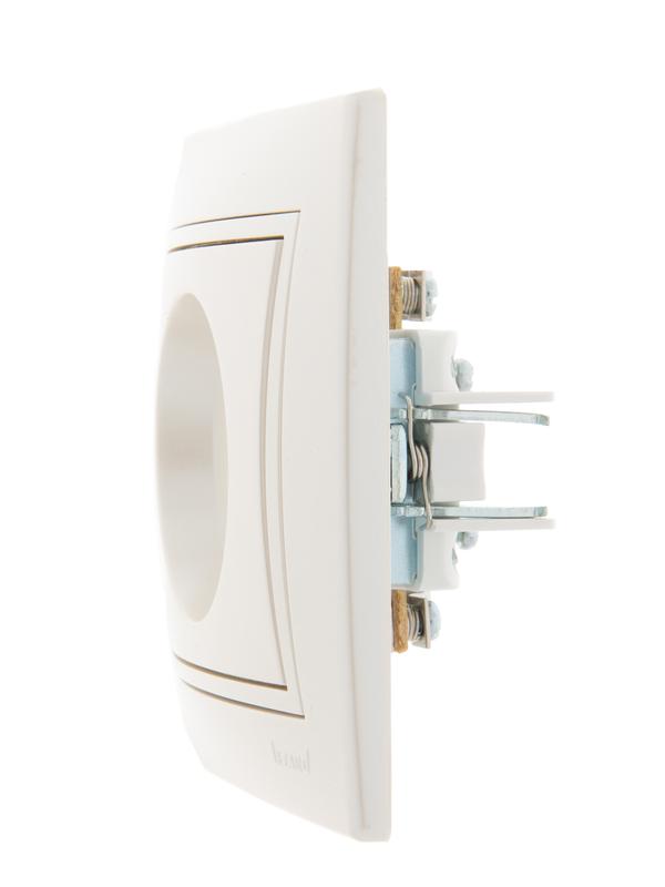 Корпус представляет собой форму из негорючего пластика, перламутрового цвета, с защитными шторками, автоматически закрывающими гнезда розетки при вынутой вилке. Основание керамическое. Подпружиненные лапки крепления обеспечивают комфортный и легкий монтаж изделия. Предусмотрена возможность установки без применения монтажной коробки.