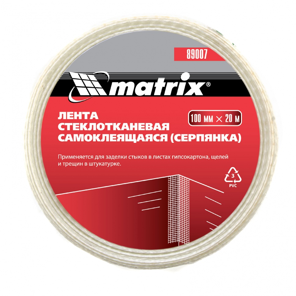 Самоклеящаяся серпянка Matrix 89007 шириной 100 мм и длиной 20 м предназначена для армирования щелей, трещин и стыков. Применяется для оштукатуривания стен, в частности, при монтаже гипсокартонных листов. Также подходит для ДВП, ДСП, металла и других материалов. Повышает прочностные характеристики поверхностей. Серпянка изготовлена методом перевивочного плетения, что придает ей прочность. Благодаря сетчатой структуре под ней не образуются воздушные пузыри. Для ее использования не требуются специальные инструменты — она легко режется ножницами. Лента-серпянка используется во время отделочных работ.