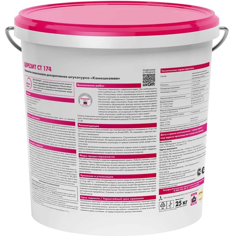 Технические характеристики «Штукатурка декоративная силикатно-силиконовая Церезит CT 174 «Камешковая» 1,5 мм база А белая, 25 кг»