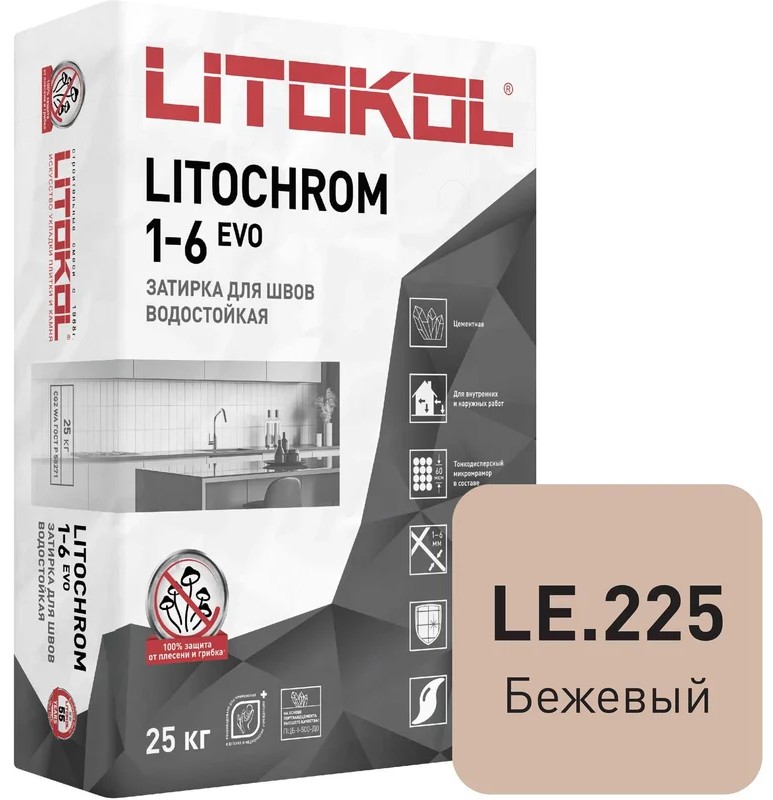 LITOCHROM 1-6 EVO — цветная цементная затирочная смесь для заполнения межплиточных швов шириной 1-6 мм с противогрибковыми свойствами. Имеет улучшенные технические характеристики – пониженое водопоглощение и повышенную стойкостью к истиранию, относится к классу CG2 WA согласно классификации ГОСТ Р 58271.