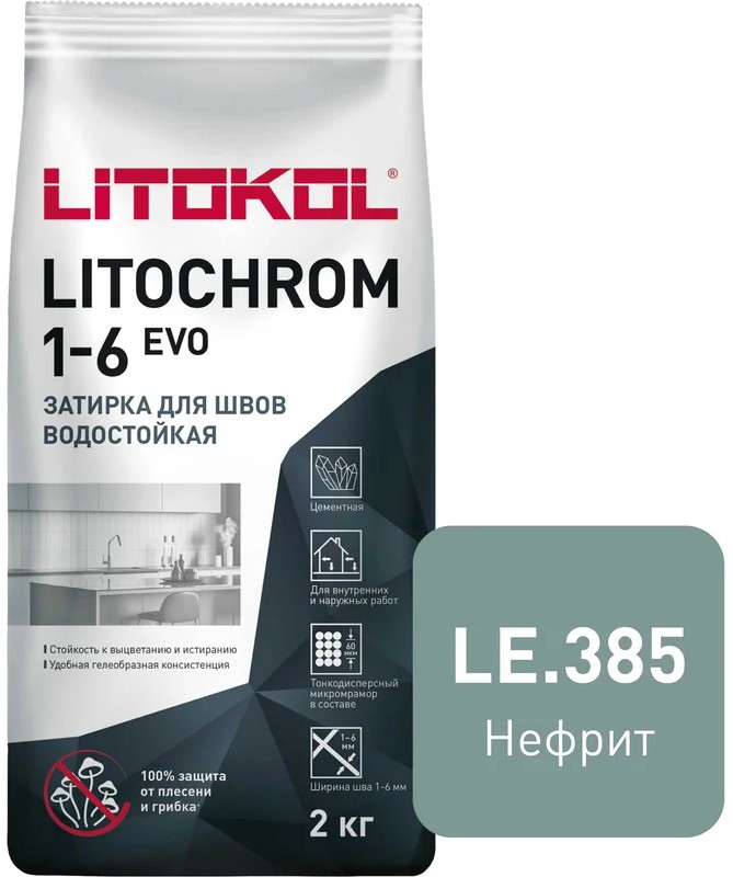 Затирка цементная Litokol Litochrom 1-6 EVO LE.385 нефрит 2 кг — это надежное решение для красивых и долговечных швов. Идеально подходит для помещений с повышенной влажностью, сохраняя цвет и защищая облицовку от плесени.